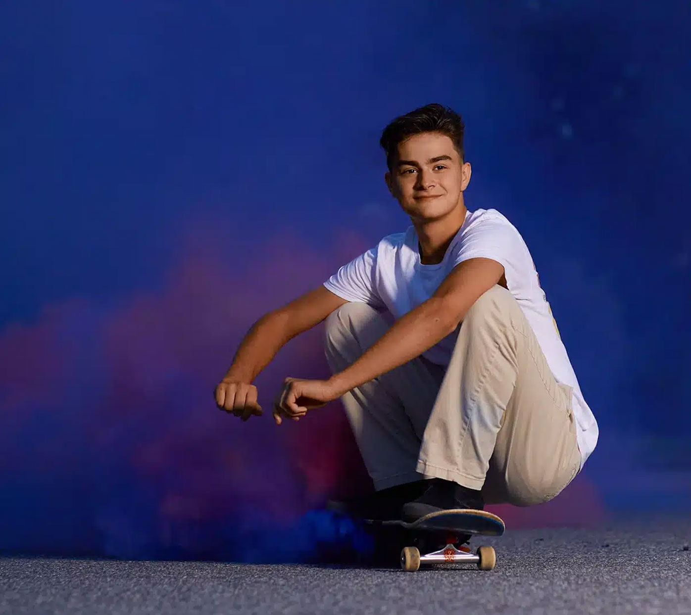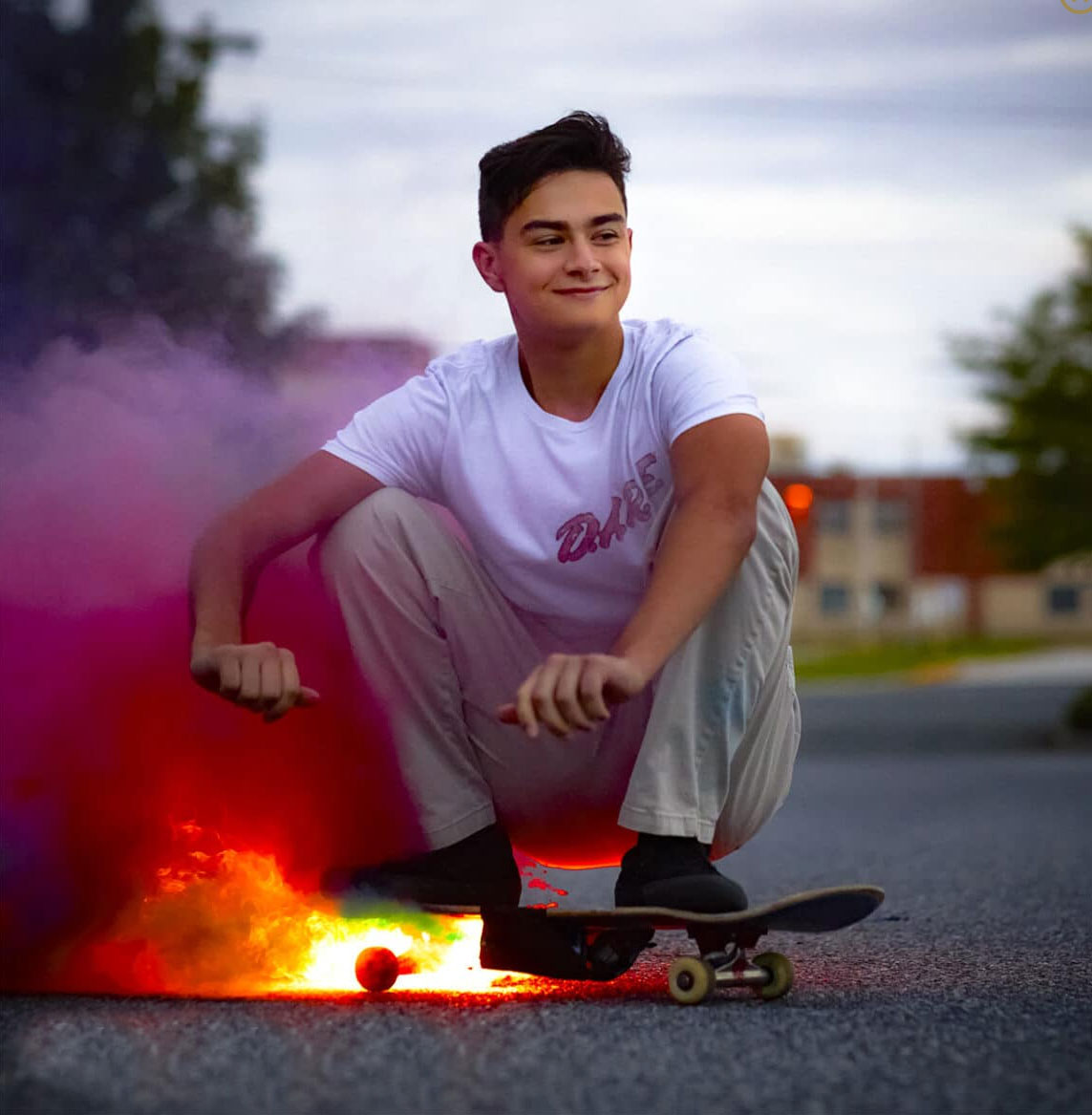 Adding Some Cool Smoke In The Background, Really Took His Images To The Next Level. After, We Headed Outside To Take What We Like To Call The “Mom Pictures” AKA The Photos That Make Mom Cry Because Her Child Is Smiling And About To Graduate From High School :). Finally, With The Last Look Of The Day, We Tried Something That Made Evan’s Photos Literally Catch On Fire. We Taped Two Smoke Bombs Under The Skateboard And… You Can Clearly See What Happens Next If You Watch The Video Below!
