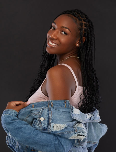 Once We Knock These Photos Out And Make Sure They Are Perfect, Raina’s High School Cap And Gown Photo Was Way Too Easy! Her Cap And Gown Photo Was Taken And Perfected In The First Try! Now, We Still Took Multiple Photos Of Her In Her Gown, But Nope! First Photo Was Absolutely Perfect! Next, We Went To The Fashionista Part Of The Senior Experience Photoshoot. Raina Bought A Range Of Cute Outfits To Feel Confident And Model. First, We Hit A Black Background With A Pink Outfit, That Raina Paired With A Distressed Jean Jacket.
